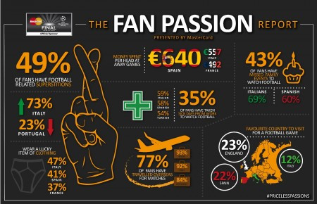 Istraživanje „Izveštaj o navijačkim strastima“ sprovela je kompanija Censuswide za potrebe kompanije MasterCard. Ono je uključivalo 5.017 ispitanika u 11 evropskih zemalja – Engleskoj, Nemačkoj, Španiji, Francuskoj, Holandiji, Italiji, Turskoj, Rusiji, Švedskoj, Portugaliji i Mađarskoj.