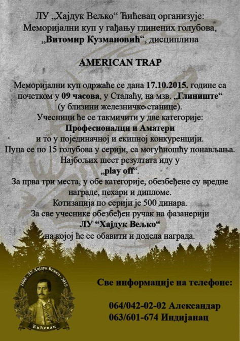 Lovačko udruženje „Hajduk Veljko“ iz Ćićevca organizuje memorijalni kup u gađanju glinenih golubova „Vitomir Kuzmanović“ u disciplini amerikantrap u subotu 17.10.2015. u 9 sati na mestu zv. „Glinište“ u Stalaću. Kup jep osvećen i nosi ime nedavno preminulog poznatog lovočuvara ovog društvaVitomira Kuzmanovića – Vite Snage, čoveka koji ima velike zasluge za razvojlovstva i ovog lovačkog udruženja.