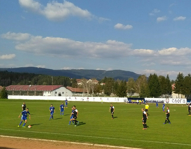 Nakon desetak minuta igre,šansa za goste.Centaršut sa desne strane Dobrić ne uspeva da pretvori u gol sa 7-8 metara.Lopta odlazi pokraj leve stative.Ubrzo zatim dolazi do promene rezultata u korist Sloge.Protićev ubačaj sa levog boka Nastić pokušava da ukroti,lopta mu ispada,dolazi do Vasilića,koji pogađa,gotovo iz „mrtvog ugla“.Sve se odigralo u 13. minutu. Već u 19. minutu, nova prilika za „plave“.Radosavljević je bio neometan,desetak metara od gola,no tukao je „nebu pod oblake“.Gosti uspevaju da uspostave balans i u par navrata prete,uglavnom iz prekida i nakon nabačenih lopti. Na isteku 26. minuta Đurđević je probao glavom,u padu,ali je Rumenić imao sreće. Deset minuta kasnije i Dobrić je šutirao na istovetan način – preko gola!