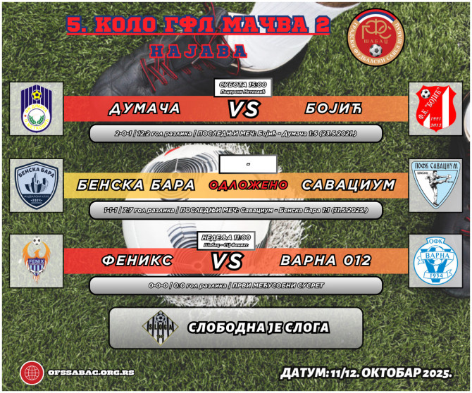 Feniks i Varna su prošlog vikenda doživeli svoje prve poraze u grupi Mačva 2, tako da će igrati sa ciljem da izbegnu vezani neuspeh. Ovo će im biti prvi međusobni susret. Svaka grupa ima ekipu bez boda, a u ovoj to je još uvek Dumača. Priliku da to promene imaće protiv Bojića, kao domaćini, mada gosti stižu u dobrom raspoloženju nakon dobre partije u duelu sa Feniksom. Slobodna ekipa je vodeća Sloga iz Bogosavca, kojoj će se usled odložene utakmica pridružiti Benske Bare i Savacium.