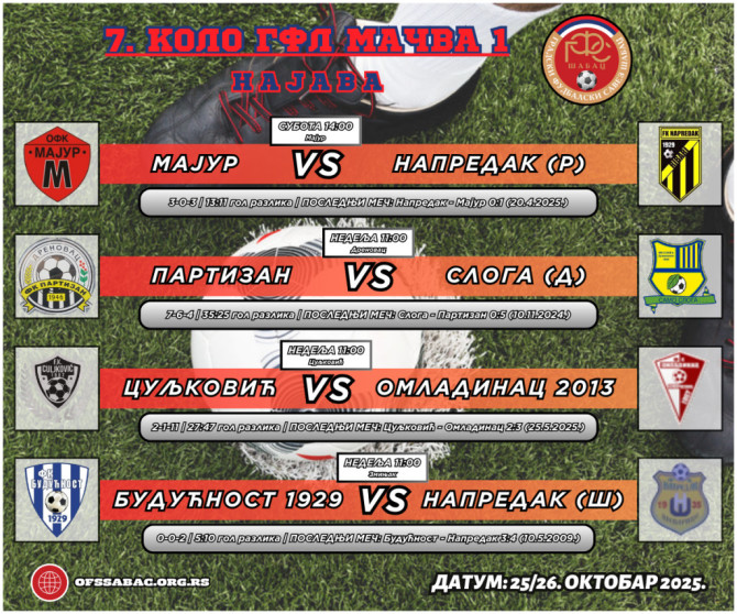 Nema sumnje da u grupi Mačva 1 derbi predstavlja utakmica Majur - Napredak (R), s tim da Culjković - Omladinac ne zaostaje mnogo po svom značaju. Samo jedan bod deli Majur i Napredak, iako su drugi i četvrti na tabeli nakon 6. kola. Culjković će igrati protiv tradicionalno neugodnog rivala iz Slepčevića kojeg je nadigrao tek dva puta u 14 utakmica (2-1-11). Gosti imaju četiri boda manje od mesta u plej-ofu tako da su bodovi preko potrebni. Seriju uspeha Partizan će težiti da nastaviti kod kuće, u susretu sa Slogom, koja za razliku od njihove četiri pobeda, ima toliko poraza u nizu. Mnogo je prošlo od kada su se na terenu našli Budućnost i Napredak (Š) - čak 16 godina. Ta sezona bila je jedna od najboljih u istoriji Napretka jer su bili prvaci, prilikom čega su ekipu iz Zminjaka savladali oba puta (6:2 i 3:4).