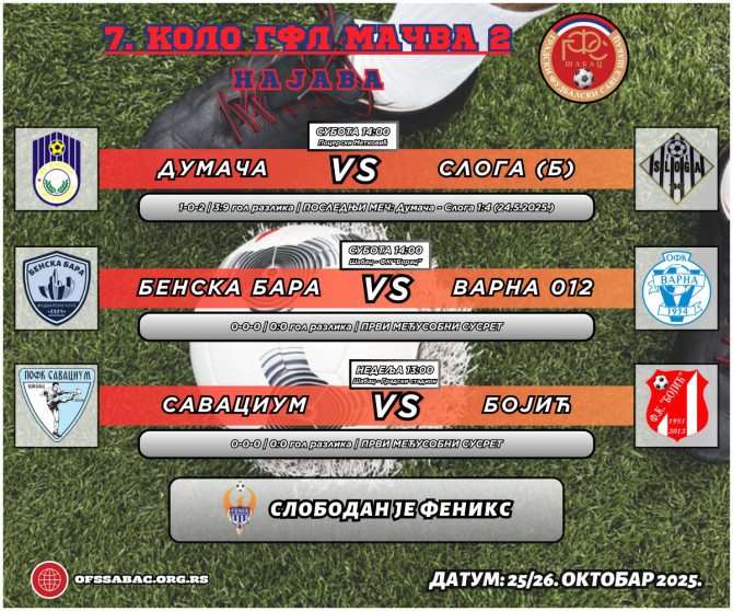 U grupi Mačvi 2 nešto manje ovako uzbudljivih mečeva, posebno kada imamo meč prvog i poslednjeg. Dumača će dočekati Slogu sa kojom su prve utakmice igrali prošle sezone kada su gosti sva tri puta odnosili pobedu - 2:1 za Slogu. Sa druge strane, Savacium - Bojić i Benska Bara - Savacium igraće prvi put. Tabela jeste nekompletna, ali i pored toga, sve ove ekipe imaju šansu da se bore za plej-of pozicije, s tim su domaćini blagi favoriti. Feniks je slobodan u ovom kolu.