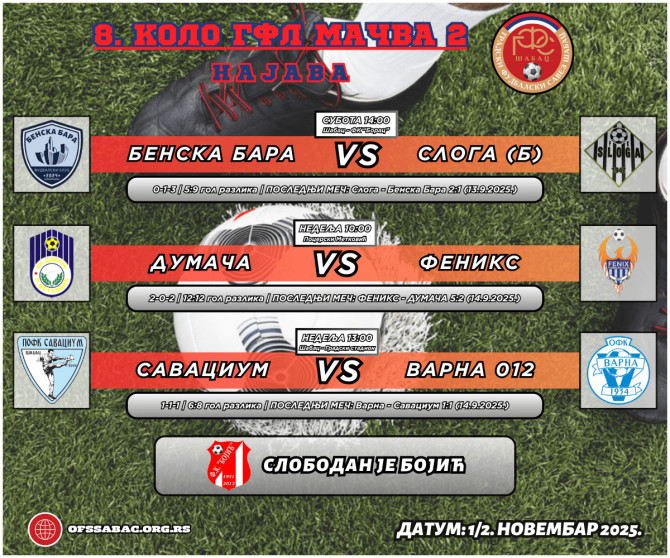 Usled velikog broja epiloga pitanje jesenjeg prvaka veoma je zanimljivo u grupi Mačva 2. Odgovoru bi mogli biti bliži nakon derbi duela Benskih Bara i Sloge. Iako su do sada odigrali 4 veoma neizvesne utakmice, ekipa iz Bogosavca uspela je da ostane neporažena, uz tri pobede i jedan nerešen ishod. Trenutno najbliža ekipa lideru iz Bogosavca - Savacium, pokušaće protiv Varne da ostvari i četvrtu pobedu iz isto toliko utakmica koliko je bio domaćin. Tako bi u dobrom raspoloženju dočekao gostovanje Slogi. Dumača će biti prva ekipa koja će otići na zimsku pauzu jer će biti slobodni u 9. kolu. Tako da im je meč sa Feniksom, kod kuće, poslednja šansa da zabeleže prvi ovosezonski trijumf. U 1. kolu, Feniks je bio ubedljiv pobedivši sa 5:2, iako je na poluvremenu bilo 1:1.