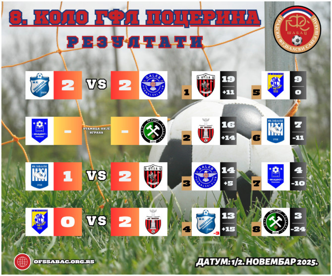 Prvi dan osmog kola u šabačkim gradskim ligama bio je veoma zanimljiv za ispratiti kada su se odigrale tri neizvesne i kvalitetne utakmice u tri različite grupe, i sve su završen nerešenim ishodom, samo različitim rezultatima. Najviše golova bilo je na Jevremovcu gde su igrali Pocerina i Galeb (2:2). Dva puta su Cerovčani vodili, ali to nije bilo dovoljno da i drugi put slave protiv Pocerine. Majur i Omladinac su podelili po bod odigravši 1:1. Domaći su poveli golom Nenada Miletića u 27. minutu, da bi izjednačenje doneo Miloš Mršović u 55. Tragičar susreta je Ibro Aličić iz redova Majura koji je promašio jedanaesterac u 83. minutu. Golova nije bilo na meču u Šapcu, gde su igrale Benske Bare i Sloga. I jedni i drugi su imali svoje šanse, koje su ostale nerealizovane usled čega su oba tima upisala prvi remi u sezoni.