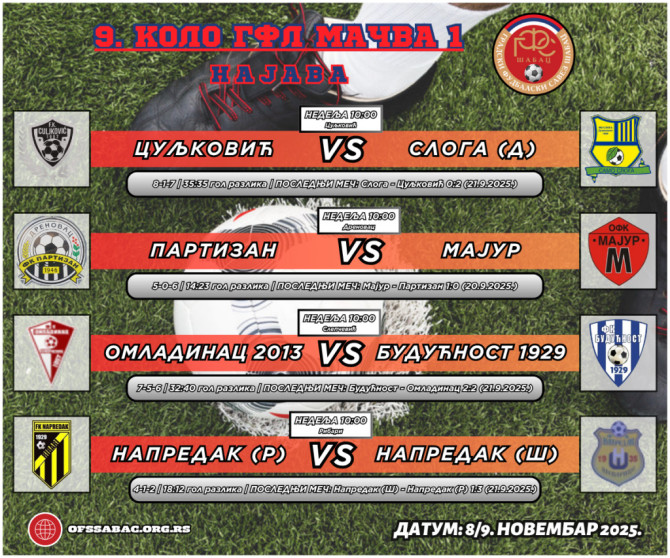Culjković je najbliži osvajanju jesenje titule u grupi Mačva 1, na putu na kojem mu stoji Sloga. Favoritu bi i bod bio dovoljan zbog boljeg skora od Majura i Partizana. U prvoj utakmici Culjković je bio bolji i slavio sa 2:0 u Duvaništu. Derbi grupe pripada upravo pomenutim Partizanu i Majuru koji će igrati u Drenovcu. U dosadašnjih 11 utakmica nerešenih nije bilo i pobeđivali su isključivo domaćini. Napredak iz Ribara moraće u duelu sa imenjakom iz Ševarica da pronađe izlaz iz serije lošijih rezultata zbog čega im je plej-of pozicija ugrožena. Tom mestu nadaju se Omladinac i Budućnost, koji imaju tri, odnosno dva boda manje od Ribaraca, s tim da ekipu iz Zminjaka, vikend kasnije, očekuje i neodigrana utakmica sa Slogom iz 6. kola. Prvi meč ova dva tima imao je dinamičnu završnicu, sa čak dva gola u nadoknadi vremena drugog poluvremena, nakon čega su bodovi podeljeni.