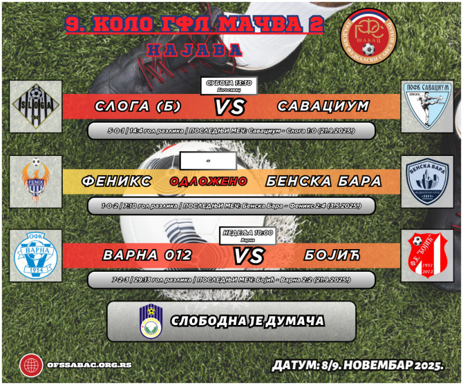 U grupi Mačvi 2 tri ekipe su još uvek u trci za lidersko mesto tokom zime - Sloga, Savacium i Feniks. U ovom kolu igraće ekipe koje zauzimaju susedne pozicije na tabeli, što znači da bi trebali očekivati tri neizvesna i kvalitetna susreta. U Bogosavcu na programu će biti derbi prva dva tima, Sloge i Savaciuma. Sloga bi jedino sa pobedom osigurala prolećnu pol-poziciju, što znači da bi se ujedno revanširali Šapčanima za minimalni poraz u prvoj utakmici (1:0). Benske Bare i Feniks neće igrati u nedelju i utakmicu 9. kola, već u petak u okviru 2. kola, utakmicu koju su prethodno odložili. Ekipe nisu mnogo udaljene od vrha tabele i imaju izvesnu prednost po pitanju plej-ofa. Tu prednost imaju u odnosu na Varnu i Bojić, koje su pored tabele i geografske komšije. Prvi meč je bio rezultatski neizvestan, kada je Varna uspela da nadoknadi deficit od dva gola i ostane neporažena na gostovanju (2:2). Zbog slobodnog vikenda, svoje takmičenje u prvom delu polusezone ranije je završila Dumača.