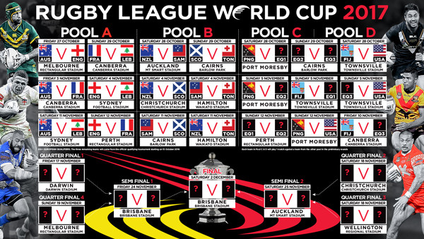 Svetsko prvenstvo 27. oktobra 2017. godine u Melburnu otvoriće branilac trofeja Australija i Engleska, kojima će društvo u grupi A praviti još Francuska i Liban. U B grupi igraće Novi Zeland, Samoa, Škotska i Tonga, dok će u grupama C i D biti po tri reprezentacije. SP u ragbiju 13 u prvoj fazi ima specifičan raspored, pa će selekcije u ovim grupama igrati i utakmice između sebe, odnosno svaka ekipa će odigrati tako po tri meča.