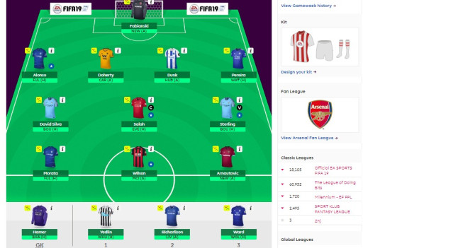 Na golu je Fabijanski. Protiv Njuke mislim da će Vest Hem dobiti pa očekujem i CS ili bar odbrane od Fabija. Odbrana je dobra. Alonso protiv Fulama realan CS ili napadački bodovi. Doerti protiv Kardifa igra vjerovatno i zadnji meč u mom timu izuzev ako me ne kupi nečim. Pereira protiv Votforda bi mogao donijeti napadačke bodove ali defanzivne teško. Što se tiče Danka, protiv Hadersfilda možda donese bodove.