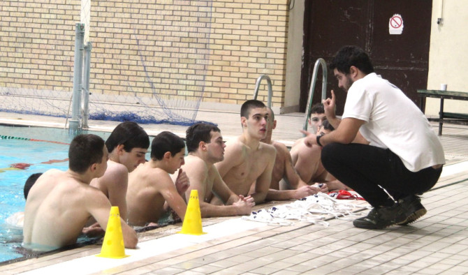 Dogovor trenera Miloša Brkljača i vaterpolista Bečeja pred trening - foto: V. Jankov