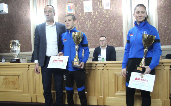 Predsednik opštine Bečej dr Vuk Radojević sa najuspešnijim sportistima Sonjom Vukšić i Matejom Nemetom (foto:V. Jankov)